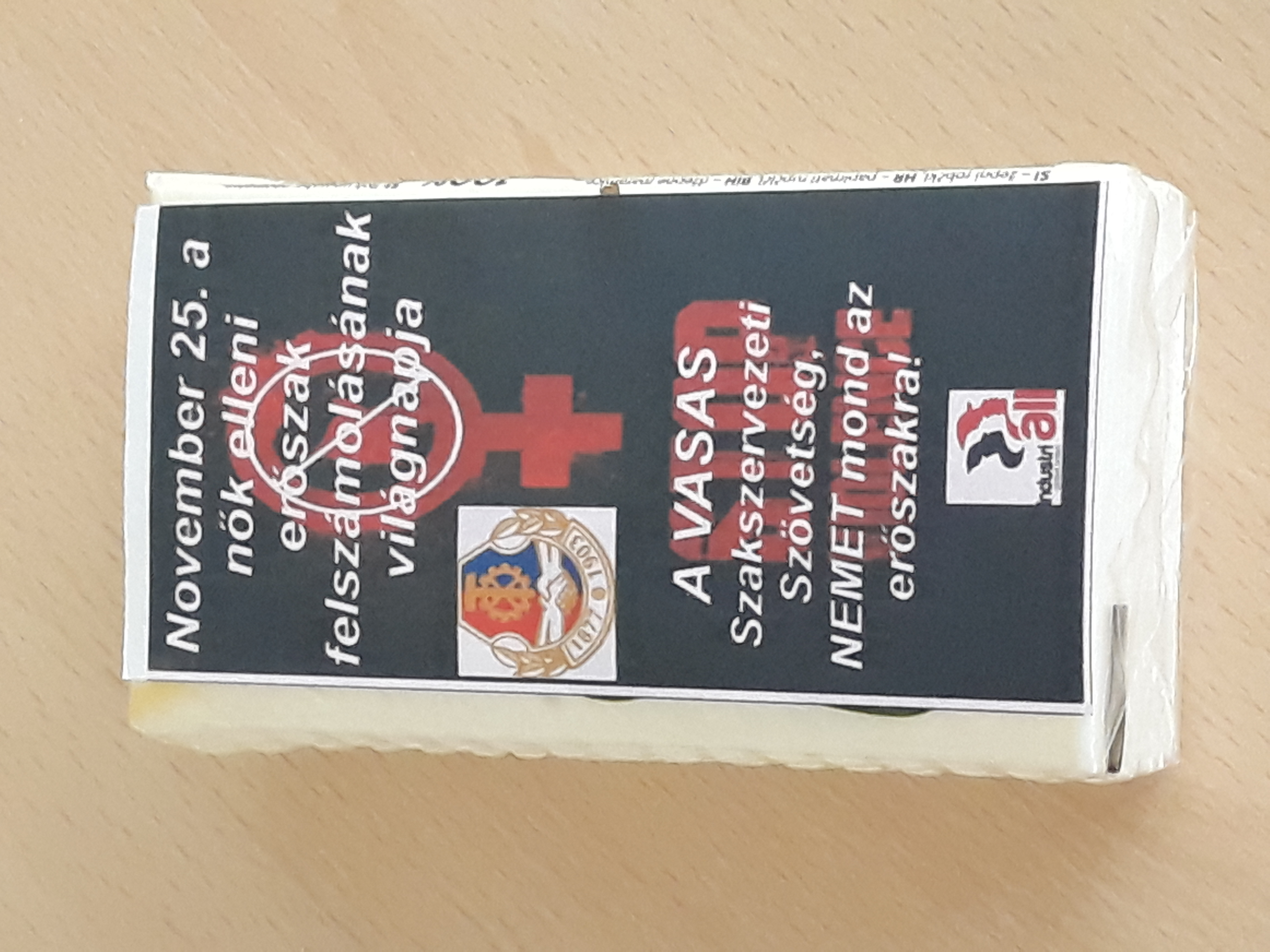 Ezért a Vasas Szakszervezeti Szövetség Nőbizottsága november 12-i ülésén kinyilvánította, hogy csatlakozik az IndustriALL Global felhívásához és akciót hirdet. Az akció keretében felmatricázott papírzsebkendő csomagokat osztogat minden Vasas rendezvényen és a munkahelyeken, hogy felhívja a figyelmet e nap fontosságára. A Vasas Szakszervezeti Szövetség NEMET mond az erőszakra!