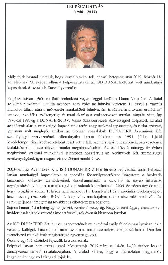 Fájdalommal értesültünk róla, hogy FELPÉCZI ISTVÁN volt szaktársunk, aki 1989-től 1993-ig a Dunaferr DV. Vasas Szakszervezeti Szövetség elnöke volt, 72 éves korában türelemmel viselt hosszú betegség után elhunyt.