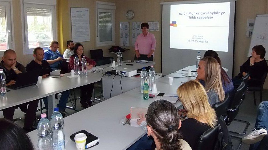 Mátészalkán, a HOYA ZRt-ben már hagyományosnak mondható a Munka Törvénykönyve főbb szabályairól szóló előadás, amelyet ebben az évben is Tarsoly Imréné, a Vasas Szakszervezeti Szövetség kitűnő szakértője tartott 2017. április 28-án.