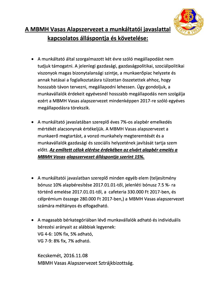 Mérnökök és Technikusok Szabad Szakszervezete (MTSZSZ) helyi szervezete a Vasasok háta mögött aláírt a vállalattal. KITARTUNK a tagok és a kollektíva igényei mellett! Honlapunkon és facebook oldalunkon is igyekszünk folyamatosan hírt adni a tárgyalások menetéről. A sztájkról szóló általános információ itt olvasható:https://mbm.vasasok.hu/