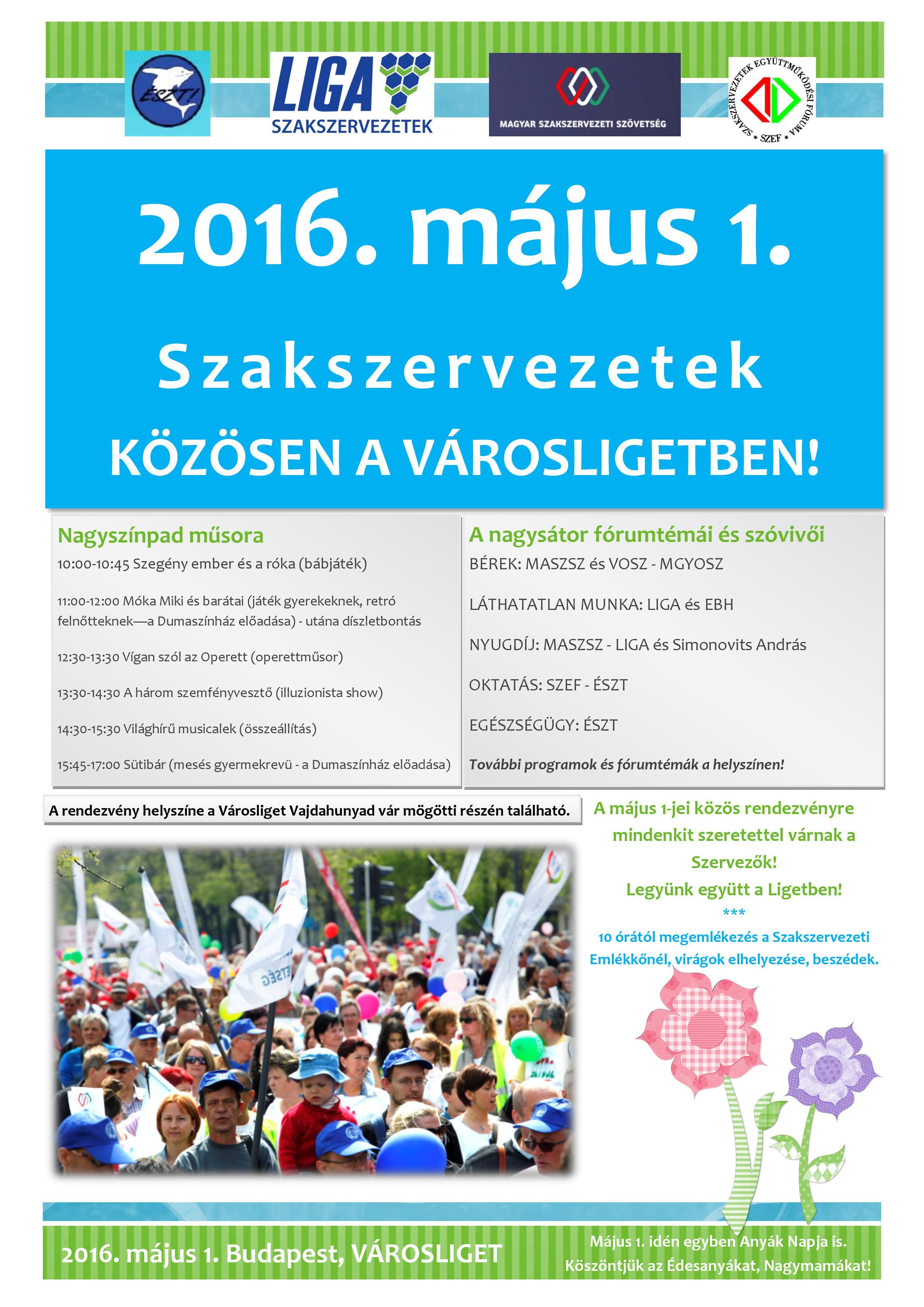 A magyarországi szakszervezeti konföderációk idén együtt ünnepelnek május elsején, a városligeti Napozóréten. A MaSZSZ, a SZEF, az ÉSZT és a LIGA konföderáció közös nagysátorban szervez fórumokat és beszélgetéseket, míg az ágazati szervezetek saját sátorhelyet bérelhetnek maguknak. A Vasas sátrát a szokott helyen találjátok. Ez a munka, a munkások ünnepe. Gyere, ünnepelj velünk! Az eseményről bővebb információ itt olvasható.