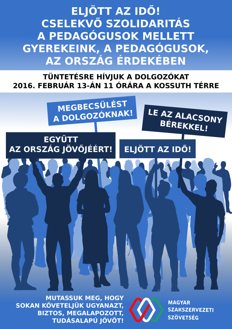 A Magyar Szakszervezeti Szövetség is mozgósítja tagjait a hétvégi pedagógustüntetésre. A cél, hogy minél népesebb küldöttséggel érkezzenek a demonstrációra. Aki egyet ért a pedagógusok követeléseivel és van lehetősége rá, csatlakozzon a résztvevőkhöz!