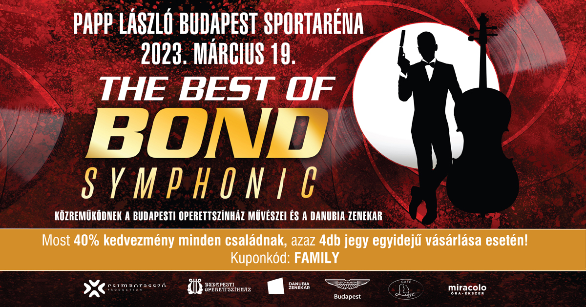 A Papp László Budapest Sportarénában 2023. március 19-én este egy látványos és elegáns koncertshow-n mindenki néhány órára maga is személyesen beléphet a Bond univerzumba az ikonikus James Bond filmslágerek segítségével. A "The Best of Bond Symphonic" előadásban fellépő művészek: Füredi Nikolett, Janza Kata, Polyák Lilla, Nádasi Veronika, Dolhai Attila és Homonnay Zsolt a Danubia Zenekar kíséretében. Jegyek már 5.940,-Ft-tól vásárolhatók EZEN a linken. Páros jegy vásárlásakor a VALENTIN kódot használva 30% kedvezménnyel vásárolhatnak jegyeket, míg 4 db jegy egyidejű vásárlásakor a FAMILY kódot használva 40% kedvezményt kaphatnak. Jó szórakozást kívánunk!