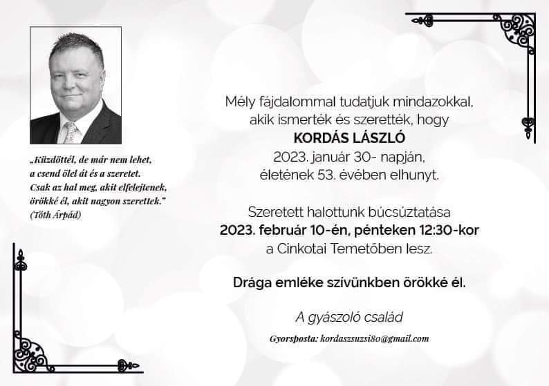 Szeretett halottunktól  2023. január 31-én 10:45 órakor veszünk végső búcsút az Új Köztemetőben. A  búcsúztatás jellegére tekintettel a család kérése, hogy a résztvevők legfeljebb egy szál virággal róják le kegyeletüket az elhunyt földi maradványa előtt.