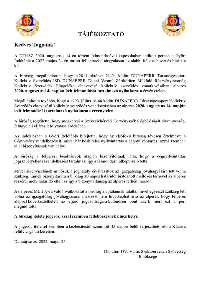 A Dunaferr kollektív szerződésének jogtalan felmondása ügyében is pert nyertek a Dunaferr DV. Vasas Szakszervezeti Szövetség vezetői, amiről ITT található bővebb információ.