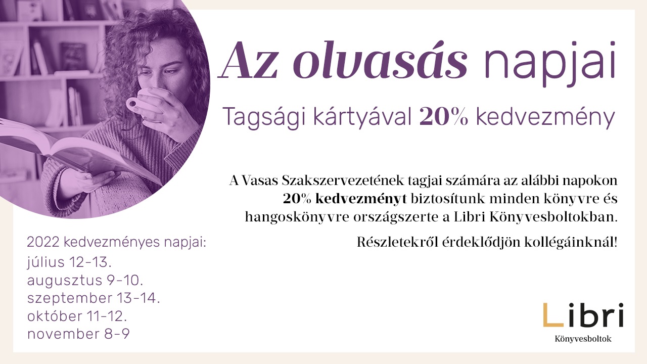 A Vasas és a LIBRI szerződést kötött, mely alapján a könyvesboltok országszerte kedvezményes könyvvásárlási lehetőséget biztosítanak a Vasas szakszervezeti tagoknak. A kedvezményes időszak november végéig tart, és a Vasas tagkártya felmutatásával, havonta 2 napon 20%-al olcsóbban vásárolhatunk könyveket a Libri üzletekben. A kedvezményes napokról ITT tájékozódhattok!