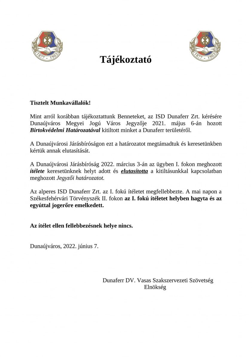 A Dunaferr DV. Vasas Szakszervezeti Szövetség ma tájékoztatót adott ki Dunaújváros jegyzőjének Birtokvédelmi Határozatával kapcsolatos perükben született II. fokú ítéletéről. A bíróság helyben hagyta az I. fokon hozott határozatot, elutasította a szervezet vezető tisztségviselőinek kitiltásáról szóló jegyzői határozatot. A tájékoztató erről a döntésről ITT olvasható.