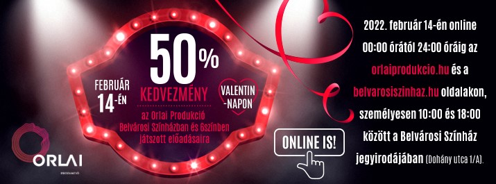 Ajándékozza meg partnerét egy közös élménnyel Valentin-nap alkalmából, vagy lepje meg magát néhány színházjeggyel! Február 14-én 50% kedvezménnyel vásárolhat februári és márciusi előadásokra szóló jegyeket! A kedvezmény a Belvárosi Színház és a 6szín mindegyik Orlai-produkciójára érvényes. Ne hagyja ki a felkínált lehetőséget, nézze újra a közönségkedvenceket!