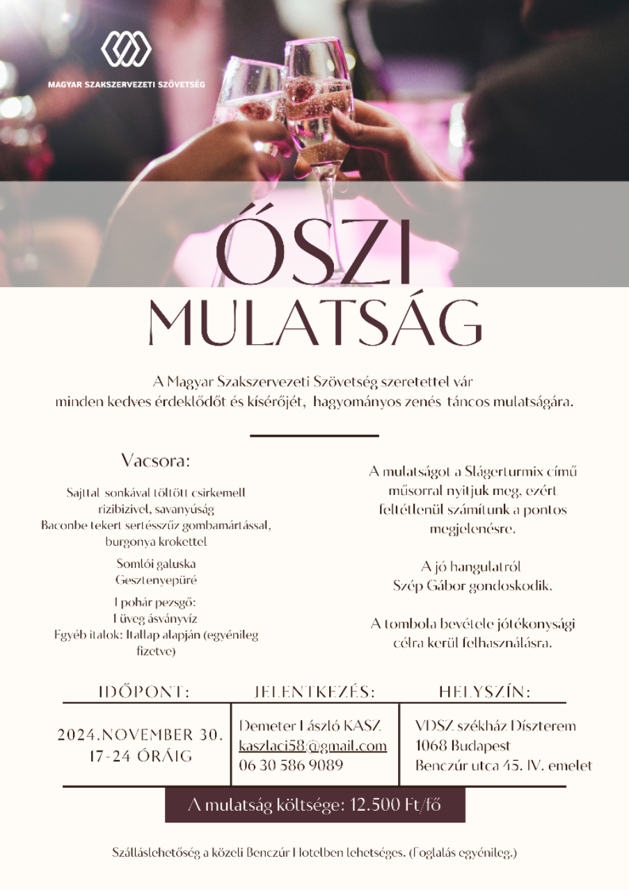 A Magyar Szakszervezti Szövetség november 30.-án a VDSZ Székház dísztemében zenés, műsoros mulatságot rendez, melynek részleteiről ITT olvashattok.