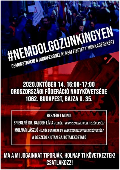 A Dunaferrnél kialakult helyzet tovább súlyosbodott. A cég a szeptemberi béreket csak részben fizette ki a dolgozóknak a törvényes határidőig. 2020. október 10-éig a munkavállalók 200.000,-Ft nettó bért kaptak meg, a maradék kifizetését október 22-éig ígérik átutalni. A kollektív szerződésből fakadó további juttatások (így pl. a nyugdíjpénztári és egészségpénztári befizetések) megfizetését pedig akkorra ígéri a vállalat, amikor azt a pénzügyi lehetőségei megengedik. Ezért demonstrációt hirdetünk október 14-én délután 16 és 17 óra között az Orosz Föderáció Nagykövetsége elé (1062 Budapest, Bajza utca 35.) Követeljük a bérek, juttatások azonnali kifizetését! Kérjük, hogy a tüntetésen történő részvételetekkel biztosítsátok támogatásotokról, szolidaritásotokról az ISD Dunaferr dolgozóit, az ottani Vasas tagokat! Emellett helyi kollégáink köszönettel várják szolidaritási üzeneteiteket is a következő email-címre: babel.b@vasasok.hu