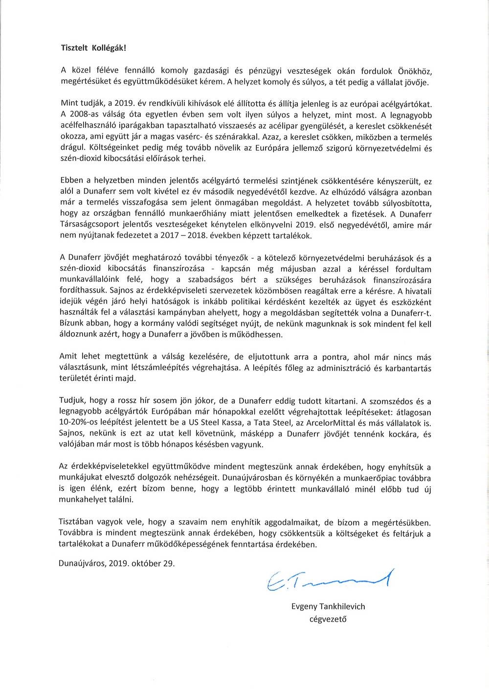 Az ISD Dunaferr Zrt. cégvezetője Evgeny Tankhilevich komoly gazdasági és pénzügyi veszteségekről adott hírt, továbbá létszámleépítéseket harangozott be tegnap a dolgozóknak kiküldött levelében. Az már több más forrásból is tudható, hogy a 2019-es év rendkívüli kihívások elé állította és állítja jelenleg is az európai acélgyártókat. A legnagyobb acélfelhasználó iparágakban tapasztalható visszaesés az acélipar gyengülését, a kereslet csökkenését okozza, ami együtt jár a magas vasérc- és szénárakkal. Azaz, a kereslet csökken, miközben a termelés drágul. A költségeket pedig még tovább növelik az Európára jellemző szigorú környezetvédelmi és szén-dioxid kibocsátási előírások terhei. Ebben a helyzetben minden jelentős acélgyártó termelési szintjének csökkentésére kényszerült, ez alól a Dunaferr sem volt kivétel. A cégvezető szerint a munkaerőhiány miatti béremelés is tovább rontotta a helyzetet. A Dunaferr társaságcsoport mindent megtett a válság kezelésére, de már nincs más lehetőség, mint a létszámcsökkentés, másképp a cég jövőjét tennék kockára. A leépítés főleg az adminisztráció és a karbantartás területét fogja érinteni. A levélben utalás található arra is, hogy az érdekképviseletekkel együttműködve igyekeznek a leépítés legkevésbé fájdalmas lebonyolítására és kormányzati segítségre is számítanak a helyzet megoldása érdekében.