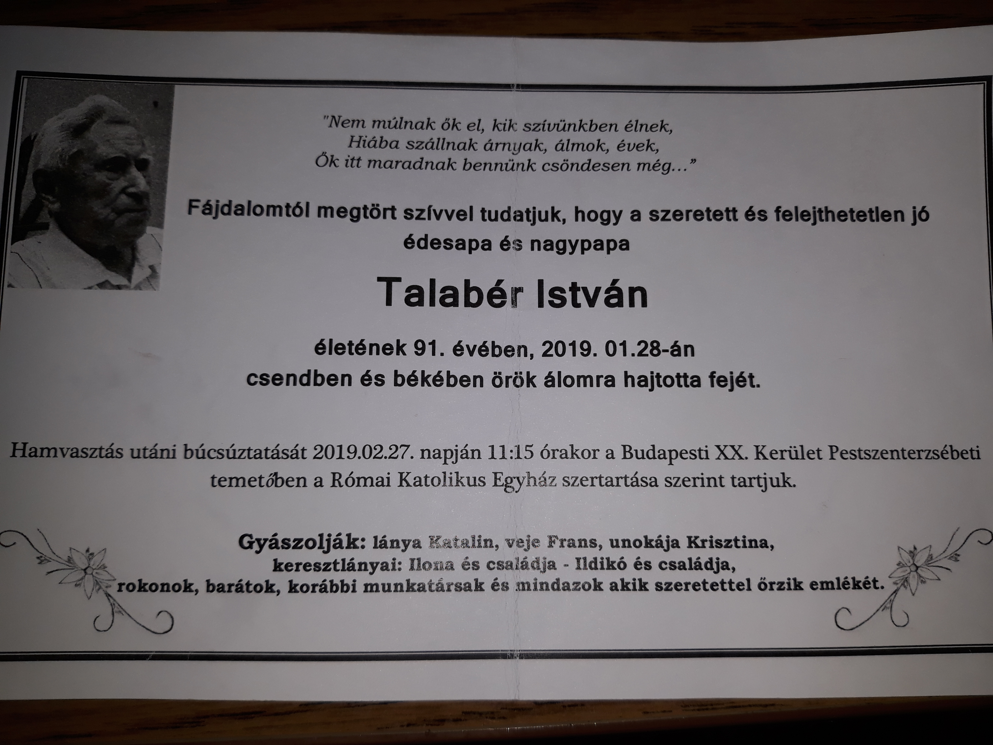 Temetésére 2019. február 27-én 1115 órakor kerül sor a XX. kerületi, Pestszenterzsébeti temetőben.