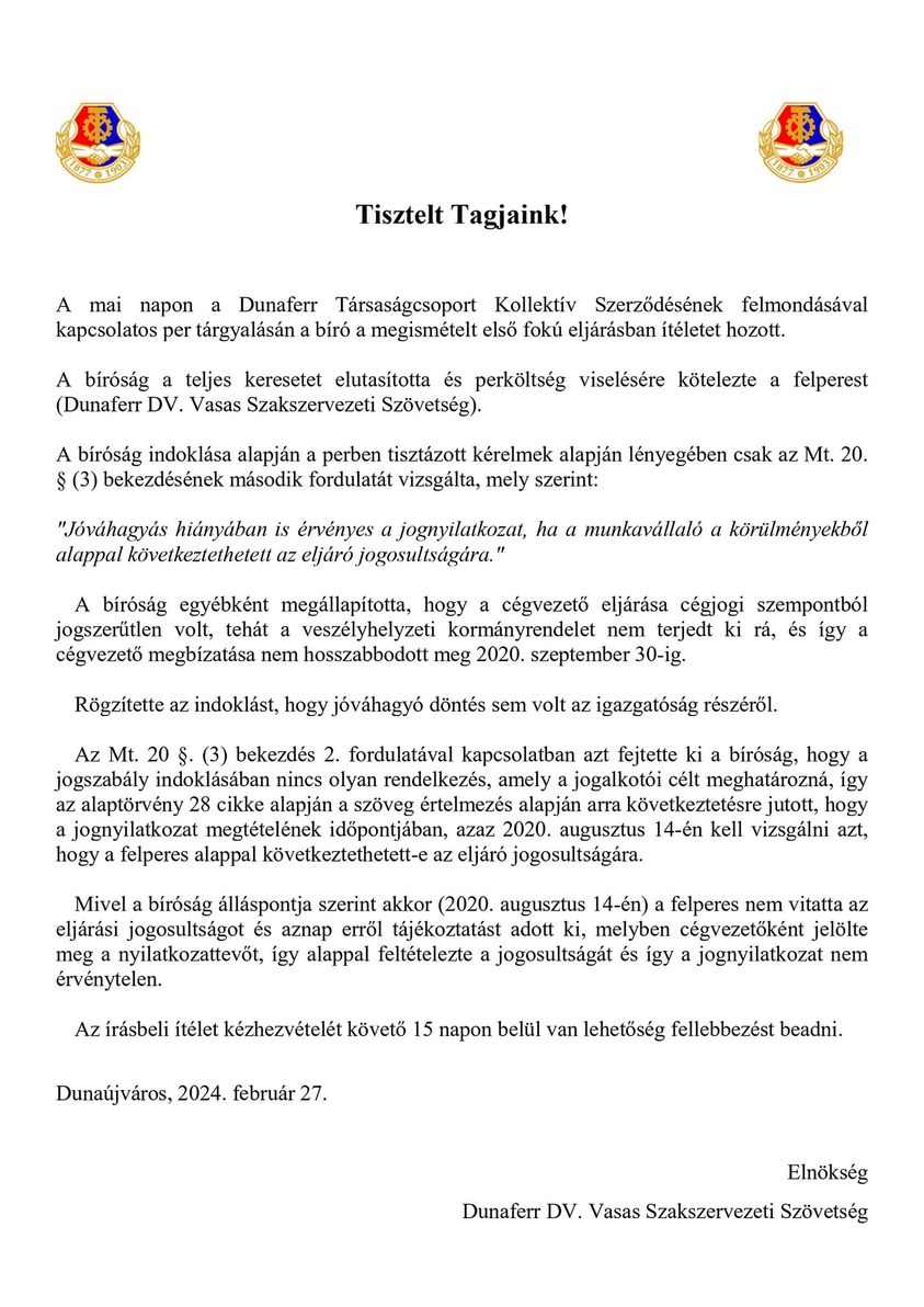 Új ítélet született a Dunaferr DV. Vasas Szakszervezeti Szövetség a Kollektív Szerződés jogszerűtlen felmondása miatt indított perében. ITT olvasható a helyi szakszervezet tájékoztatója. Ez is egyfajta értelmezése a jognak, és nem mondható munkavállaló és szakszervezet barát döntésnek.