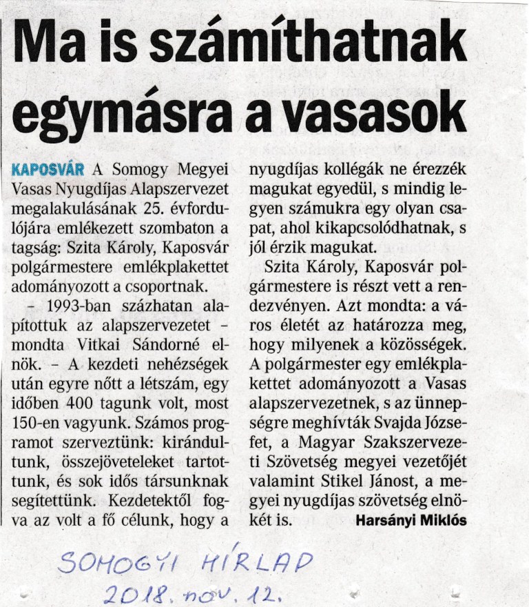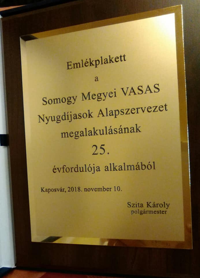 20181110 1oMegalakulásuk 25. évfordulója alkalmából ünnepi ülést tartottak a Somogy Megyei Vasas Nyugdíjas Alapszervezet tagjai. A vendégek között volt a város polgármestere Szita Károly is, aki ebből az alkalomból egy emlékplakettet készíttetett és adott át. Meghívottként jelen volt Hanfeldt István a Vasas Nyugdíjas Szervezet elnöke, Stikkel János a Somogy Megyei Nyugdíjas Szövetség elnöke, Svajda József a MASZSZ Somogy megyei képviselője, Battyányi Beáta civil- és roma referens, az önkormányzat részéről.
