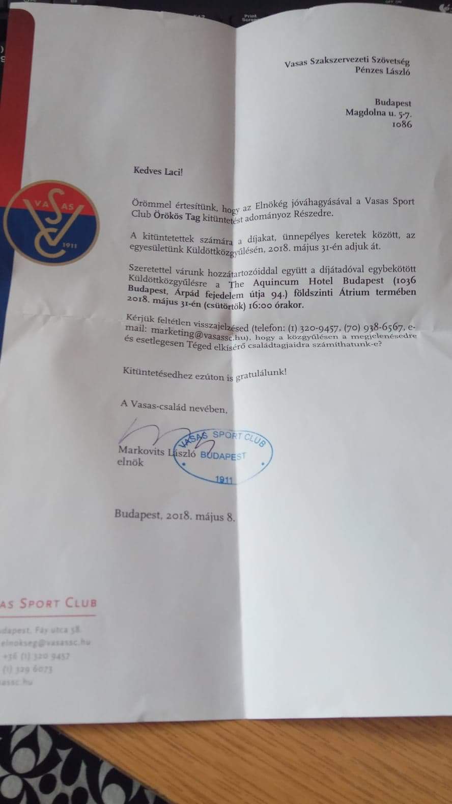 2018. május 31-én az óbudai Aquincum Hotelben tartotta éves közgyűlését a Vasas Sport Club. A hagyományoknak megfelelően a Vasas SC az éves közgyűlésen adta át díjait és kitüntetéseit, így az Örökös Bajnok, az Örökös Tag, az Aranygyűrű és az Életműdíjakat, valamint a Vasas Támogatásáért Díjat és a Breyer Zoltán Szurkolói Díjat. Összesen húszan részesültek elismerésben. Köztük volt Pénzes László a Vasas Szakszervezeti Szövetség nyugalmazott irodavezetője, a Vasas élő történelemkönyve is, aki a Vasas Szakszervezeten keresztül több mint 60 éve kötődik a klubhoz, s ennek köszönhetően lett a Vasas SC Örökös tagja.